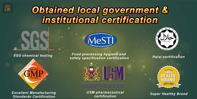 Our products are certified by KKM, Halal, SGS, MeSTI, GMP, USM and Super Health Brand to ensure the quality.